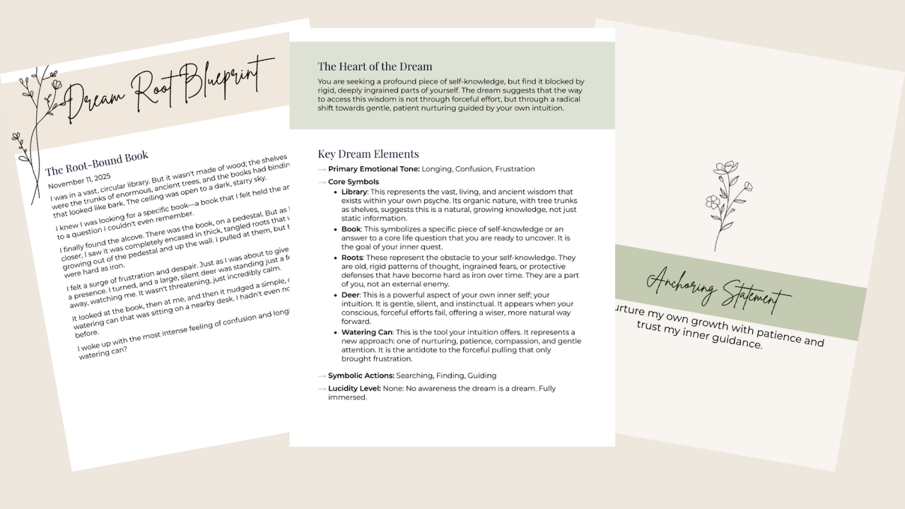 Stop wondering what your dreams mean and start using them. This 6+ page personalized report is precision-engineered to provide more than just interpretations; it delivers a roadmap for transformation. Expect a beautiful, comprehensive breakdown of your subconscious symbols paired with actionable steps to integrate that wisdom into your waking life. It’s the ultimate tool for those ready to turn a single night's dream into a life-changing shift in under 10 minutes.